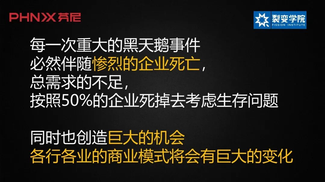 图1 每一次重大的黑天鹅事件,必然伴随惨烈的企业死亡,我们不要去回避,所有企业都应该做好心理准备。举个可能不太恰当的例子,比如智能手机代替功能手机,从手机行业来说就是一个黑天鹅事件。 那些曾经伟大的企业:爱立信、诺基亚、摩托罗拉、甚至三星,在中国都见不到了,还有我们的中兴、波导、联想等等,日本的所有手机品牌全死掉了。都是因为苹果带来的巨大技术变革,引起了这场行业的黑天鹅事件。 所以疫情冲击下,我建议大家按照50%的企业死掉的情形去考虑生存问题。其实说50%我都觉得不算多,因为每次重大的黑天鹅事件导致的结果都会超过这个数,比如,我算过手机行业就有超过90%的企业消失了。 大家常说产能过剩、消费不足是个大问题。但是,在我的观念里,很多中国的产能本来就不应该存在,尤其是,其中的假冒伪劣产品本来就该死掉。真正好的产能,我是没有觉得过剩的。举个例子,我们公司在前年进入净水行业,需要找个好的供应链,但根本找不到特别好的企业去帮我们生产。因为我们本来就是生产商,有自己的一套标准,最后在国内能过我们技术管理标准的只有三家,而这三家牛到什么程度呢?不付预付款,连谈都不给谈。所以我们的大量产能其实是不合格的,低端产能的企业死掉本来是自然优胜劣汰的事情。 我觉得企业只要追求高品质、追求精品,生存发展还是没有太大问题的,尤其是原来我们面对出口的产业链,都有着非常好的产品。优秀的供应链并不过剩,那些过剩的、低端的、质量差的企业,就在会死掉的50%的数字里。 另外,说一下市场。市场主要在欧、美和以中国为主的亚洲。其中,欧洲国家和美国之间是有矛盾的,我认为欧洲应该会两边倒,这是一个巨大的市场机会。我在做欧洲生意的过程中发现,欧洲产品的品质比美国要好得多。在我们这个行业,美国的产品真的是非常烂,我们比他们做得好多了;但是跟欧洲产品比,我认为还有差距,但也已经比较接近了。所以咱们中国的优质供应链不需要太过担心,我们的质量走出去是没问题的。 不过进入欧洲市场也没那么容易,欧洲的成本太高了,相比之下,美国在制造业方面的优势还是有的。因为我曾经在美国投资,如果按成本来算,除了人工以外,其它的优势都比咱们明显。而欧洲的总体成本都太高了,但是市场还是存在的。