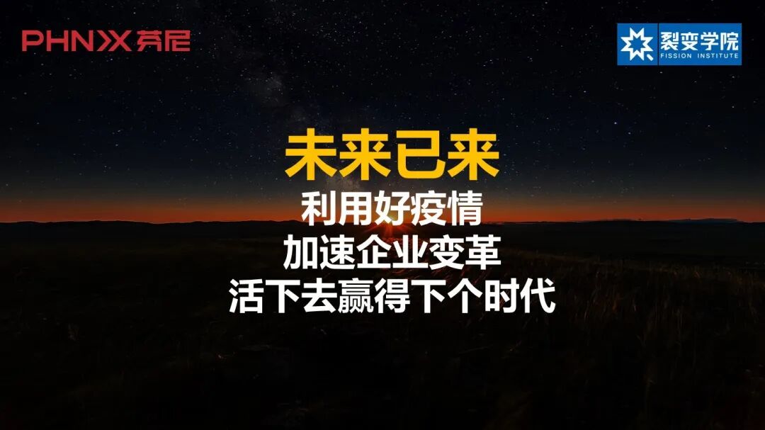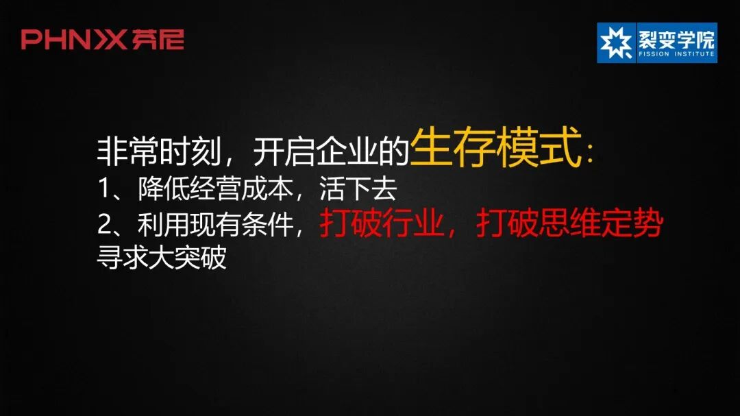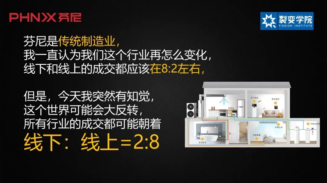 图5 新零售、新营销不能停留在口头上,现在有的企业已经把这套方法打造得非常好。 最近天猫组织了16家品牌一起做品牌联盟,从阿里巴巴的角度上来讲,它为什么要做这个事情?因为它也需要增量,对阿里巴巴来说,原来能在线上卖的产品都已经竞争很激烈。像我们这样的行业,中央空调、地暖等产品,原来在天猫上的成交量几乎是没有的,因为这都是线下的行业。现在新零售能够很好协同线下和线上的关系,反而极大地提高了商业效率,降低了营销成本。 天猫把线下的行业搬到线上,16个品牌流量互补,从原来的竞争变成了合作。例如你本来想上网为新居买某品牌的集成灶,刚好看见连在一起的芬尼科技,可能就把我们的产品也买了,因为联动的需求是存在的,我们现在在天猫上的新增销量很可观,这给了我很大的信心。当然,对于新营销工具掌握不好的企业来讲,这需求就不存在了,因为线下停摆,消费者线上线下都见不着你了。 图6 此外,裂变学院最近也线上化了,转型过程中全部运用独立小团队,我们一定要用年轻人。在这次转型中,我们找30岁以下的人做带头人,设计线上直播班。以前我们从来没干过。 从3月10号就开始招生,然后这个月就开7个班,我告诉大家,以目前的预测来看,我们5月份的营收是超过疫情之前的,这是以前想都不敢想的事情,如果没有这次疫情,绝对没这个事。所以我想告诉大家,非常时期的困难一定非常大,但如果你速度够快、创新跟得上,你就能打破行业限制、打破思维定势,寻求到突破。 图7 最后和大家分享一下稻盛和夫关于应对危机的策略,他可是经历过N次危机的人。第一,全员营销,萧条时期,全体员工都应成为推销员;第二,全力开发新产品;第三,彻底削减成本;第四,保持高生产率;第五,构建良好的人际关系。 未来已来,我们要充分预估史无前例的困难,但更要利用好疫情,加速企业的变革,活下去,只要活过这两年,就会迎来一个特别美好的未来。