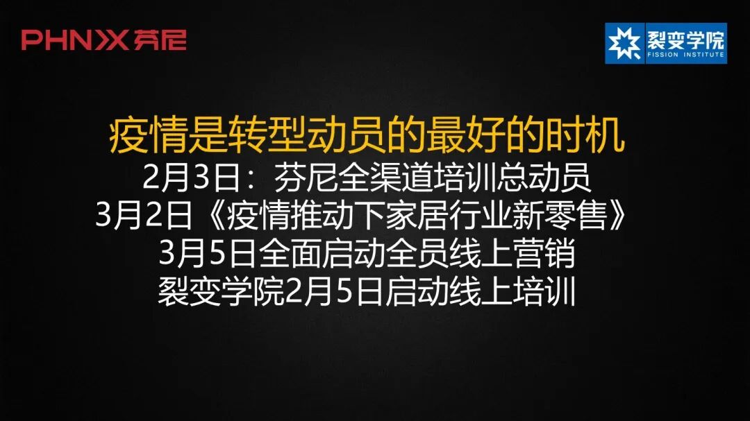 图2 在疫情之前,我们已经开始做新零售,但是推动起来非常累。那个时候我的判断是,我们这个行业不管怎么推进线上成交,线下也得占80%。但现在我改变想法了,最近线下停摆,成交几乎完全没有,而线上的销量居然很快就上去了。我现在对未来线上销售的判断是占比80%,这在以前是想都不敢想的。 现在线上办公也比传统的工作效率高多了,以前我需要来回跑几个办公室,现在我只需坐着家里进行网络会议,可以处理的事比以前更多了。还有我们以前做500人招商会的预算就要300万,现在我们线上轻松搞5000人的招商会,预算几乎为零,成本全节省下来了,这都是经济效益。 图3 同时,市场将会发生巨大的变化。在短期内,我认为内需很难补上,因为咱们的出口量实在是太大了。但是,从长期来看,如果落后产能死亡,优质产能扩大,应该是没有问题的。比如说这次疫情以后,大家对家里的健康安全不满意,就想着把房子装修得更健康,这些都是一些新需求,要是能够抓住这些新需求,就是发展的机会。 同样的,新教育、新电商、新办公等等改变本来正在发生,只是疫情硬生生地把2-5年的进程缩短到几个月的时间,搞到大家都压力很大,但对转型快速的企业来说是没有问题的。利用好危机去转型,我觉得是所有企业都该做的事情,不要指望在顺风顺水的时候改革。 图4 分享一下我们最近转型在做的一些事情。我们是在1月28日接到通知说要延期开工,当时我就觉得这次麻烦大了,当时就在企业内部写了篇文章,告诉大家假期延长不是那么简单。因为很多员工觉得可以不上班好高兴,但对我们做老板的来说压力立刻就大了。然后到2月1日,我再写了一篇说,“非常时刻预则立”;2月2日写了对这件事的预期,我们现在将步入“广积粮”阶段,让员工有思想准备,我们困难的日子来了;2月3日,我们就开始全渠道地培训总动员,给大家培训新营销。 我在2018年就开始跟抖音合作,是行业里的首家这么做的企业。那个时候的抖音在一般人的眼里就是个年轻人搞怪的地方,但我提醒所有企业,凡是有新东西出现的时候赶快拥抱,你肯定能占个大便宜。 在整个2019年,我们这个行业推动新营销非常辛苦,因为经销商根本就接受不了我们这一套做法,他们总体的感觉就是线上是敌人。经销商属于线下渠道,厂家线上化了,自身不就被跨过去了吗?无论我怎么跟他们解释,大家都是以不相信为主。我们渠道商大概超过1000家,2019年大概只推动了70多家去尝试新零售。 但是,这疫情以来的两个月,就超过300家不用解释,不用动员,主动找我们尝试新零售。线下渠道商在将来被淘汰的概率是极高的,因为他们的唯一路径就是做服务。现在线下停摆,没有门店服务了,如果你转不过来,就会慢慢被淘汰。 我还有一个公司是裂变式学院,2月5日就开始启动了线上的培训。本来这完全是一个线下的商学院,针对企业家群体,主流产品的客单价都在3天2万元左右,大家都觉得线下才能卖这么贵的教育产品。其实在这个产品线成立两年前的时候,我就提出要搞成线上,但两年都没做成,因为本来的小日子还过得挺好。 所以我给大家的建议就是疫情就是一个最好的变革机会,如果能够借助灾难的倒逼,就能有效推动整个组织去做巨大的变革,我们千万不要辜负了这次危机,一定要把它变成一种动力。