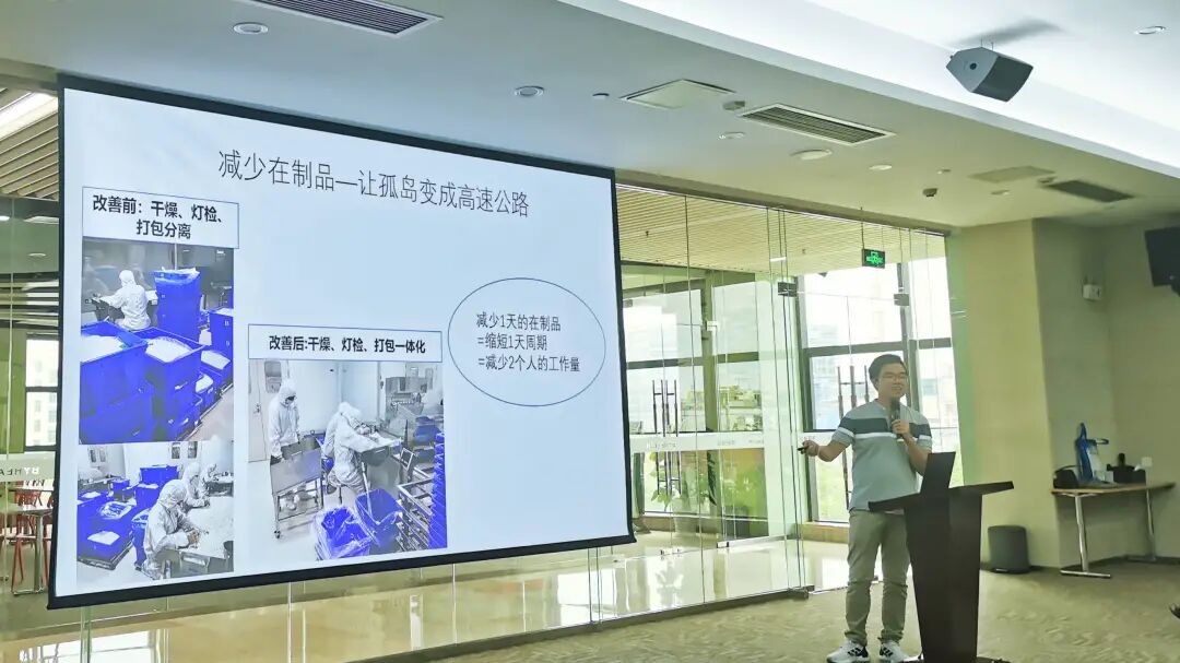 汤臣倍健精益部负责人 刘文得高级经理 参访后,汤臣倍健精益部负责人刘文得高级经理分享了精益历程,“药品行业前期投入大,但后期利润高,国家法规要求也严格,这个行业需大量的国外原材料,采购周期长,批量较大。而汤臣倍健把精益应用到生产各个环节中,在不断摸索中,目前产线的效率得到大提升。” 汤臣倍健坚持精益推进,持续改善取得优秀成果。企业QCC课题多次获得国家质量协会、药质协一等奖等荣誉,改善项目每年降低七百多万制造成本。生产制造执行系统(MES),推动生产线信息化程度,该项目目前已成为汤臣倍健智能制造核心组成部分。 汤臣倍健分享的部分改善成果: