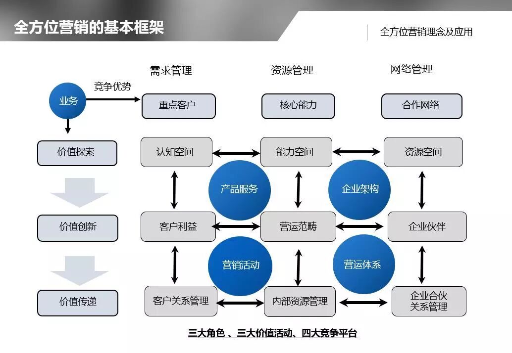 全方位营销要“跳出盒子的思考”,它跨越原有的市场分析框架,通过更大范围的思考开发出新的市场和利润增长点。全方位营销不同于传统营销的思维,而是站在战略的角度思考营争能力。
