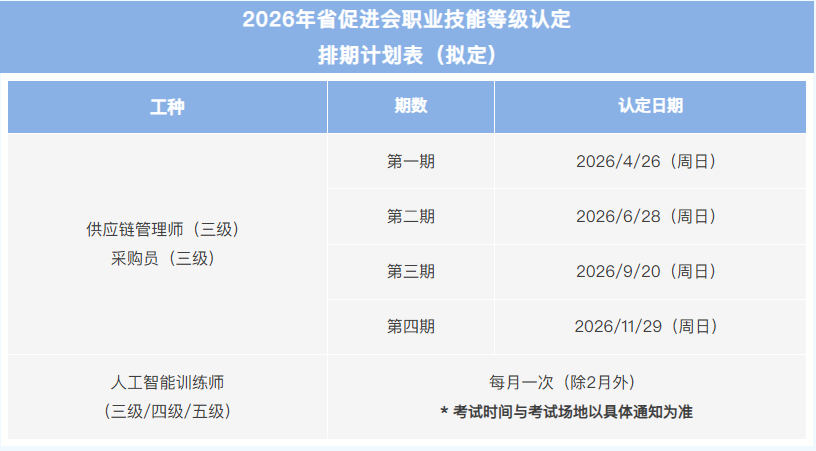 广东省中小企业发展促进会2026年将继续开展供应链管理师、采购员、人工智能训练师三个工种职业技能等级认定工作,现接受符合申报条件的人员报考,排期计划如下: