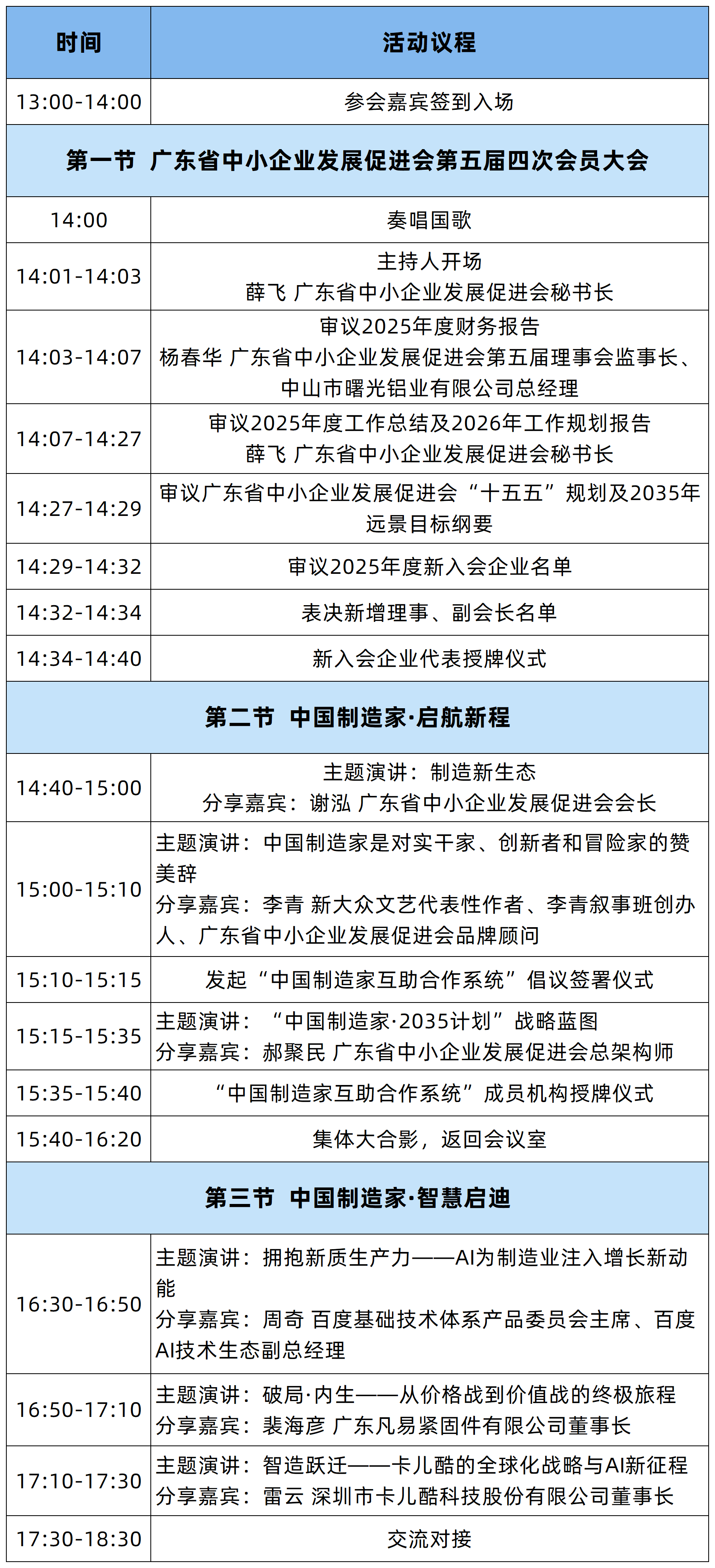 一、会议信息 01签到时间 2025年12月16日(周二)13:00-14:00 02参会时间 会员大会、论坛:14:00-17:30 自由对接交流:17:30-18:30 晚宴:18:30-20:45 03参会地点 广州白云国际会议中心3号楼二楼东方厅(广州市白云区白云大道南1039-1045号) 二、签到指引 1.签到时间 13:00-14:00 2.签到流程 签到地点:广州白云国际会议中心3号楼一楼签到处; 现场扫码签到:出示电子邀请函二维码或报名信息; 领取物料:入场凭证、专属徽章等。 3.温馨提示 建议提前到达,按时进入会场; 如有特殊情况,请提前联系专属会员顾问。 三、交通住宿指引 (一)交通指引 1. 地铁 地铁2号线【白云文化广场C口】,步行10分钟 2. 自驾 导航:白云国际会议中心3号楼 停车费:5元/小时,12小时封顶15元,24小时30元 3. 其他 白云机场(T1/T2/T3)出发:驾车约30分钟; 广州白云站出发:驾车约20分钟; 广州东站出发:驾车约20分钟; 广州南站出发:驾车约40分钟。 (二)住宿推荐 协议酒店:白云国际会议中心的岭南东方酒店(白云大道南店),报【省促进会】可享协议价,大床/双床房价格:450元/间/晚(含早)。 12月15日大床房房源紧张,请各位来宾尽早联系酒店预订,自行开票结算。联系方式:姜先生 15918759334。 四、参观动线 ◉ 参观路线 一楼正门 ➡一楼签到区 ➡ 一楼展览区【成果展+肖像艺术展】 ➡ 二楼【制造家展板】 ➡ 二楼【制造家合影墙】 ➡ 二楼主会场 制造家之门 ◉ 最佳拍照点 成果展:一楼优秀服务商、企业体验交流区; 肖像艺术展:一楼102位制造家群像; 制造家之门:二楼会议入口; 中国制造家合影打卡墙:二楼会议前厅。 中国制造家合影打卡墙 ◉ 两大展区介绍 开放时间:13:00-20:30 (全天开放) 【中国制造家·成果展】 现场汇聚了25家各具特色的优质企业及服务机构,与展位代表深度交流,获取详细资料,挖掘合作潜力。 📸【中国制造家·肖像艺术大展】 由中国人像摄影代表性艺术家史宏伟先生亲自掌镜,102位杰出制造企业家的艺术肖像作为 “2035图像志计划” 系列作品首次展出。 ❓怎么看 寻找您认识的企业家面孔 了解背后鲜为人知的创业故事 打卡留影,致敬中国制造的力量 五、牌匾和证书领取须知 请各企业注意查收电话及微信通知,指定专人到大会现场领取牌匾和证书,并提前通过报名二维码填写联系人信息。 发布时间点(拟) ①会员企业授牌仪式14:30-14:40 ②“中国制造家互助合作系统”成员机构授牌仪式15:30-15:40 ③集体大合影15:45-16:20 ④颁发【2035图像志计划・中国人物】证书19:20-20:30 ⑤颁发【专精特新企业产业冠军培育计划】结业证书19:50-20:00 六、抽奖须知 中奖者请在当天到二楼“兑奖处”指定地点领取奖品,领奖时需本人凭中奖凭证和参会凭证,在现场进行签领;逾期视为放弃兑奖。 七、会议议程 八、其他 01必带物品:充电宝 02着装要求 全体参会人员请着深色正装。 请保持服装干净整洁,并在合影前整理仪表(头发、妆容等),以最佳状态出席。 03天气 12月16日多云转晴 13-21°C 20年风雨同舟,20年相伴成长 12月16日,让我们相聚 共同见证广东省中小企业发展促进会20周年的荣耀时刻! 这不仅是一场年会,更是: 思想碰撞的盛宴 拓展人脉的平台 艺术与商业的对话 开启未来的起点 中国制造家,我们在等你! 💖现场更多精彩等你来解锁💖 如有任何疑问,可联系您的专属会员顾问哟~