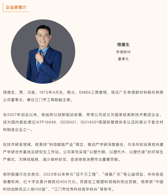 广东奇德新材料股份有限公司是一家立足于国家战略新兴产业的新材料领域,专业从事环境友好、功能性高分子改性塑料及其制品的高新技术企业。核心业务涵盖高性能改性塑料、精密模具及注塑制品、碳纤维制品。公司通过“材料改性—模具开发—精密智造”一体化服务模式,为新能源汽车、高端家电、婴童用品、电子电气等下游领域提供定制化解决方案。公司目前在广东江门、泰国等地建有生产基地,协同发展,支撑全球化交付能力。公司拥有 CNAS 认可实验室、国家级博士后工作站、广东省工程技术研究中心、广东省企业技术中心、广东省创新型试点企业、 广东省知识产权示范企业等研发平台,累计获得授权专利 34 项,参与制定多项行业标准。此外,公司还通过了 ISO9001、ISO14001、TATF16949、AEO海关高级认证体系、GRS4.0全球再生标准以及 AS9100D航空航天管理体系认证,公司产品 通过 FDA、CHCC、RoHS、REACH、EN71 等认证标准。