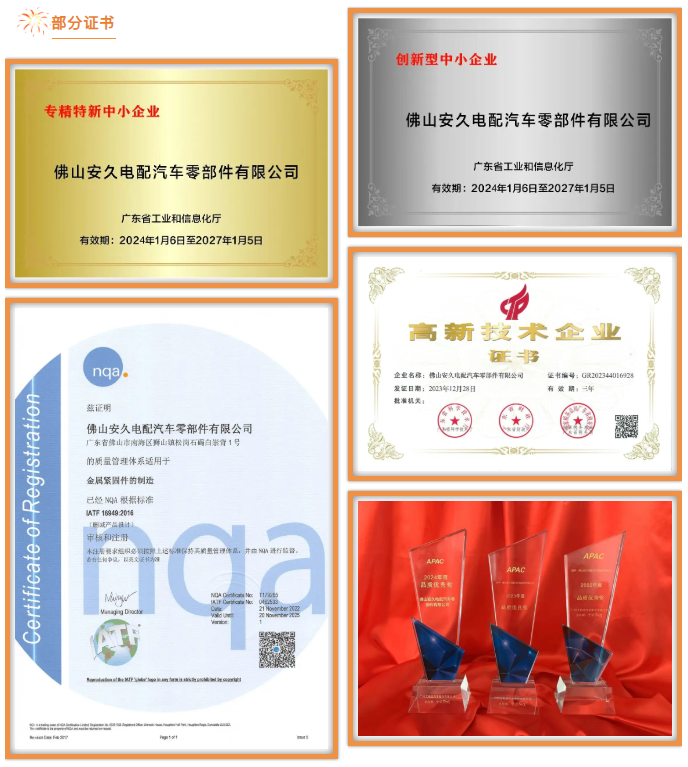 佛山安久电配汽车零部件有限公司成立于2020年,国家高新技术企业,坐落于佛山三水佛北战新产业园。专注汽车精密紧固件研发制造,产品覆盖焊接螺母、螺栓等系列,配套丰田、本田等知名车企,通过IATF16949认证,秉持“小部件,大责任”核心信念,以零缺陷品质赋能汽车安全。