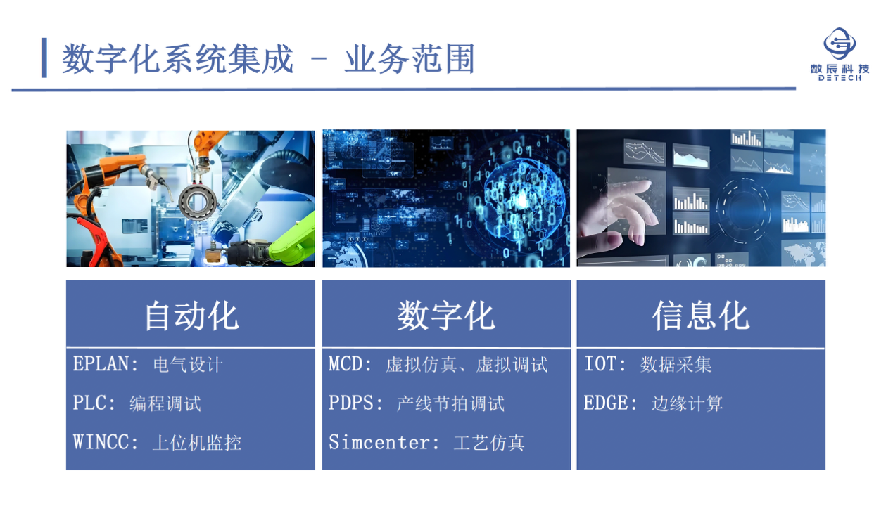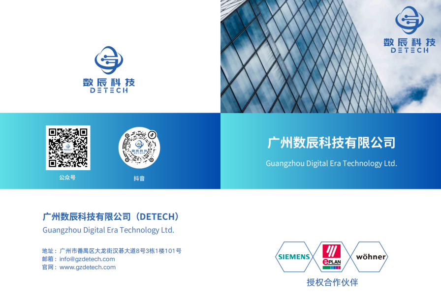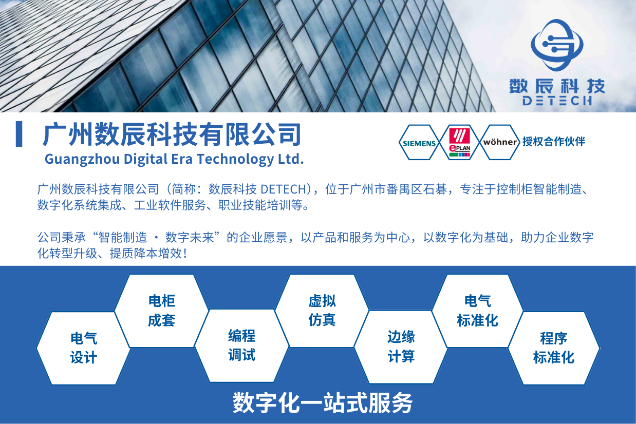 广州数辰科技有限公司(简称:数辰科技 DETECH),位于广州市番禺区,专注于控制柜智能制造和数字化系统集成等,为客户提供符合不同标准(UL/CE/IEC/GB等)的电气设计及电柜成套、EPLAN软件培训、编程调试、数字孪生、边缘计算和标准化的一站式专业服务,是西门子、EPLAN、维纳尔等国际国内知名企业的授权合作伙伴。公司秉承“智能制造 • 数字未来”的企业愿景,助力企业数字化转型升级、提质降本增效。