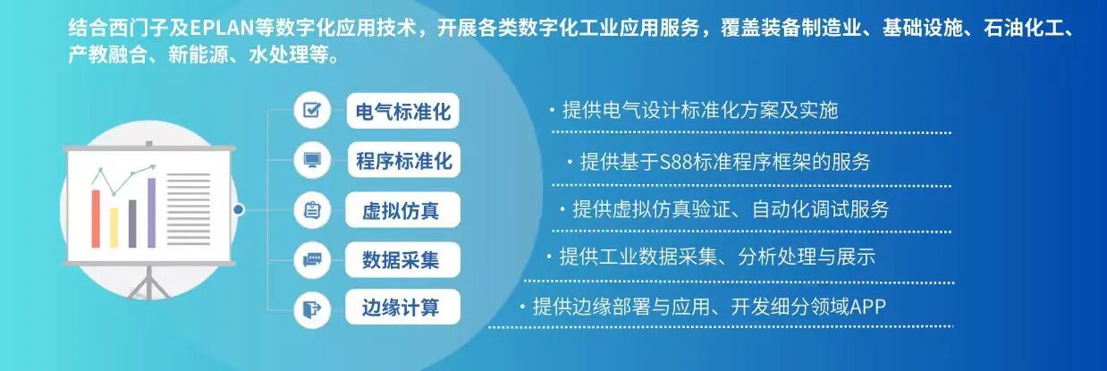 公司拥有一批经验丰富的企业高管、业务精英、资深工程师多元化专业团队植根行业,并依托西门子、EPLAN、维纳尔等德国先进电气、自动化、数字化设计集成工具,专注新技术研究,致力于为客户提供一站式全链条服务商,包含电气设计—>电柜成套—>编程调试—>虚拟仿真—>边缘计算—>电气及程序标准化,充分解决面对众多类别供应商沟通成本高与协同性弱的痛点,并辅助提质降本增效。智造数字化是国策也是时代所趋,业务团队长期服务海内外知名企业,与各行业龙头关系融洽。