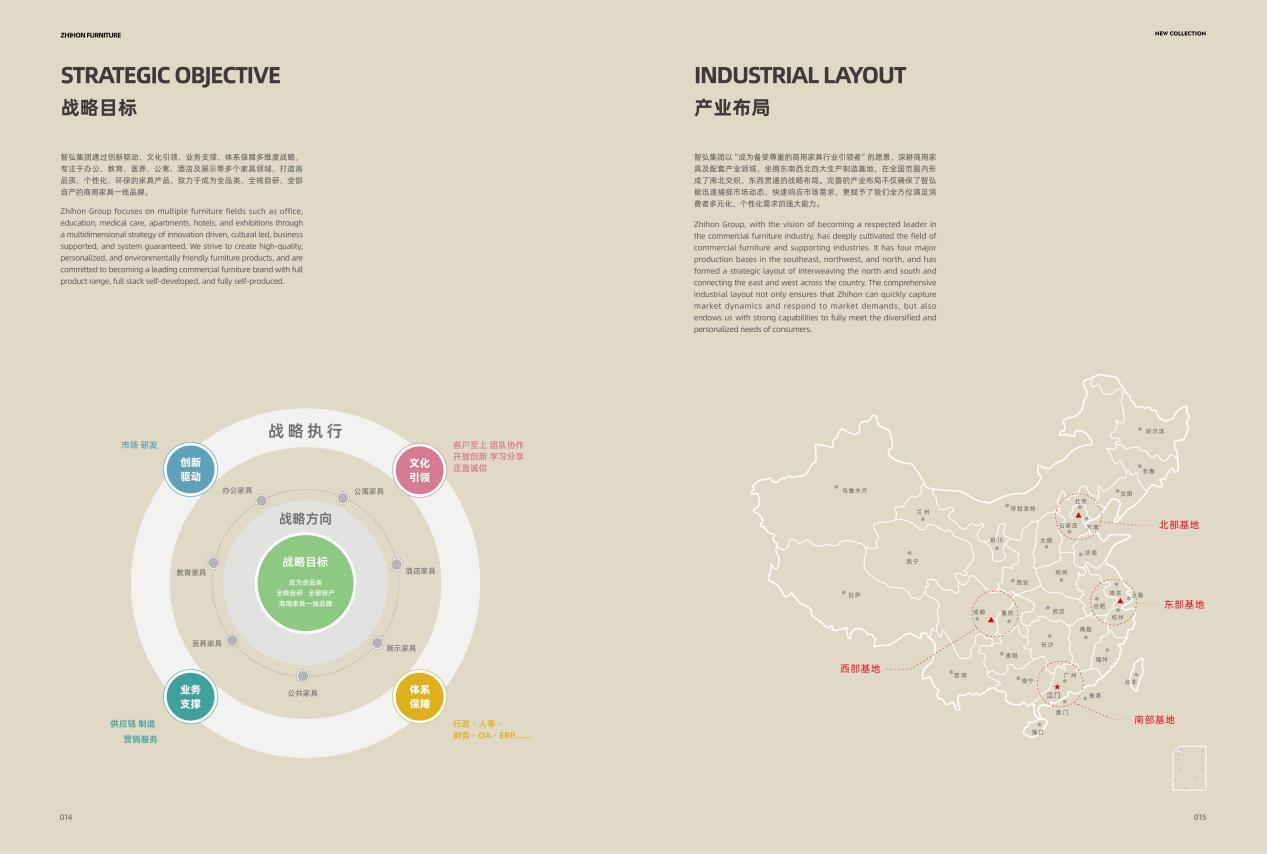 产业布局 智弘集团以“成为备受尊重的商用家具行业引领者”的愿景,深耕商用家具及配套产业领域,坐拥东南西北四大生产制造基地,在全国范围内形成了南北交织、东西贯通的战略布局。完善的产业布局不仅确保了智弘能迅速捕捉市场动态,快速响应市场需求,更赋予了我们全方位满足消费者多元化、个性化需求的强大能力。