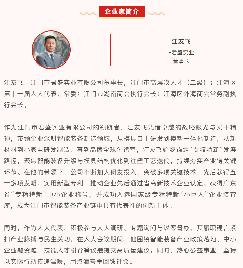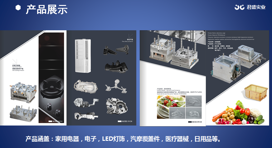 江门市君盛实业有限公司是一家集模具研发制造、塑料制品生产、物业租赁、货物进出口、品牌运营于一体的综合性实业企业。产品覆盖家电、电子、LED 灯饰、汽摩配件、医疗器械、日用品等领域。公司配备先进模具制造及检测设备 80 多台,各类精密注塑及成型设备 100 多台,为国内外知名品牌提供高品质工程塑料产品与模具一站式解决方案。企业通过多项国际体系认证,拥有多项发明专利,为高新技术企业、专精特新企业,与华南理工大学共建模具研究院。公司坚持党建引领,重视人才培养与品质提升,秉承 “君诚者昌,品高者盛” 的宗旨,致力成为行业标杆企业。