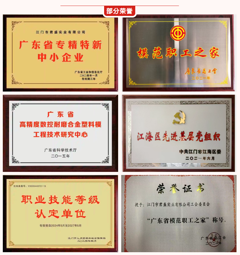 △广东省专精特新中小企业 △广东省高新技术企业 △广东省模范职工之家 △广东省高精度数控耐磨合金塑料模工程技术研究中心 △江门市人力资源和社会保障局职业技能等级认定单位 △江门市级清洁生产企业 △江海区先进基层党组织 △江海区健康促进示范企业 △江海区爱国拥军模范单位 △江海区十佳书香企业 △ISO9000、ISO14000、ISO45000、IATF16949管理体系权威认证企业