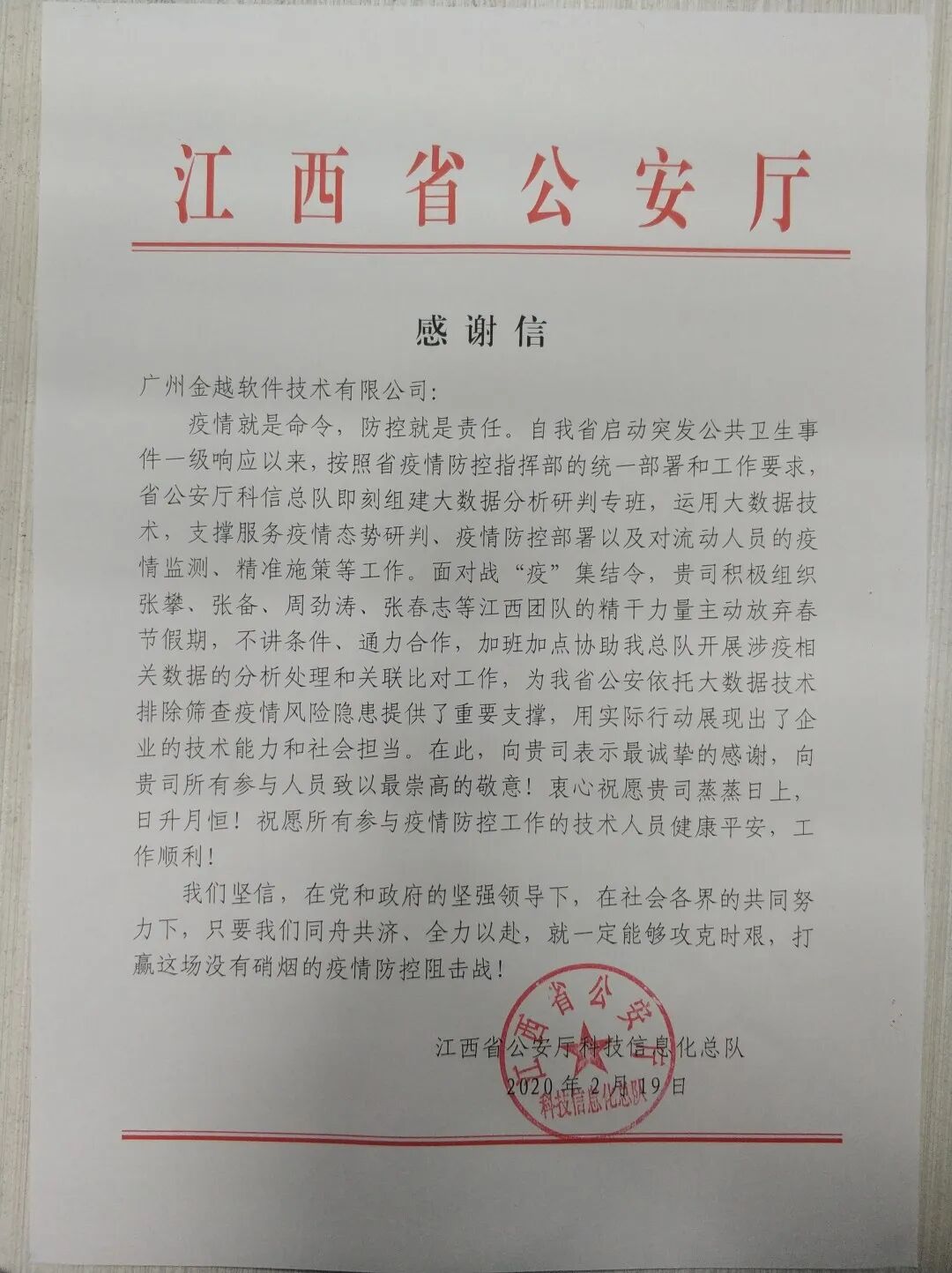 疫情期间,金越软件南昌团队深度参与江西公安大数据疫情分析研判专班,为疫情态势研判、疫情防控部署,以及流动人员疫情监测、精准施策等工作提供支撑,为此,客户专门发来感谢信。