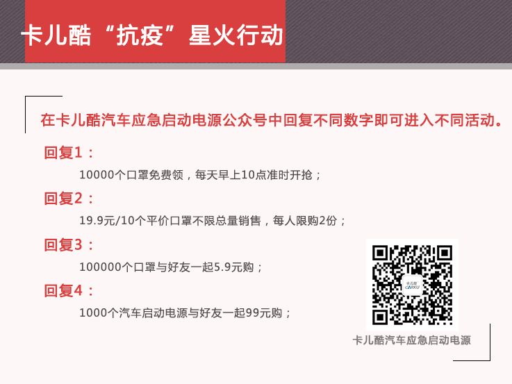 惠州市卡儿酷科技有限公司 紧急投入增产口罩 发起“抗疫”星火行动 自疫情发生后,省促进会常务理事单位——惠州市卡儿酷科技有限公司,积极响应号召,紧急投入增产口罩,已获得相关资质认证,迅速形成产能助力疫情防控。 现阶段,口罩仍为紧缺物资,进小区、公司、出行时,戴口罩已是“标配”。为解决大家口罩摇号难、购买不发货等问题,卡儿酷为大家送来一份福利!卡儿酷发起了“抗疫”星火行动,详情如下图: 识别以上二维码,进入“卡儿酷汽车应急启动电源”公众号,回复不同数字,即可参与不同活动。 口罩免费领,每天早上10点开始派送口罩10000个,全国0元送到家!另外,还有19.9元/10个平价现货口罩,即买即发货!如有大量采购需求,可联系:卡儿酷公司 杜女士 18824639646(微信同号)。 以上活动在疫情期间长期有效,疫情不退,公益不停!卡儿酷尽一份爱与责任,为大家的出行提供多一份安全保障。