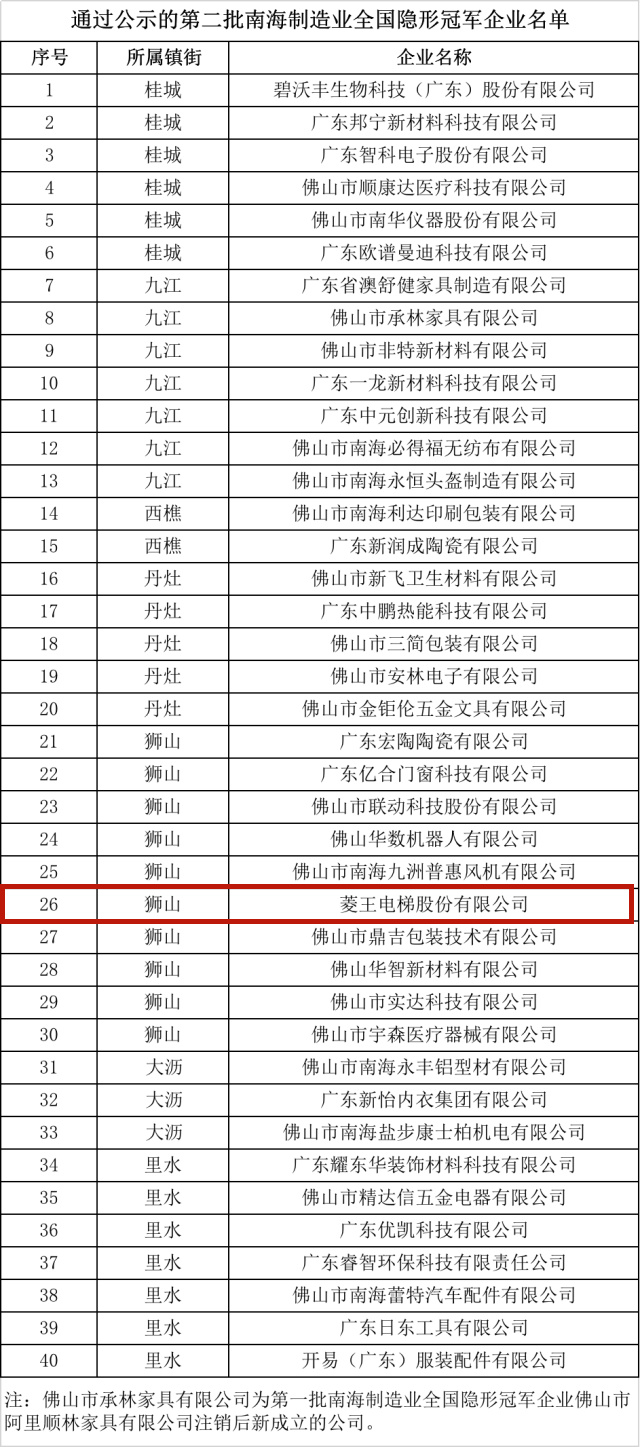 佛山市南海区启动“重振虎威 冠军力量——第二批南海制造业全国隐形冠军”,经征集报名、实地调研、评审委员会评审等程序,共40家企业获得荣耀,菱王电梯有幸成为其中一员,隐形冠军“南海军团”将得到进一步壮大和优化,锻造推动高质量发展的中坚力量。