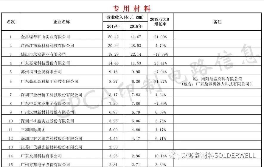 第十九届(2019)中国电子电路行业排行榜 由中国电子信息行业联合会与中国电子电路行业协会联合发布的第十九届(2019)中国电子电路排行榜近日新鲜出炉!(榜单链接:第十九届(2019)中国电子电路行业排行榜) 汉源新材料再次荣登专用材料榜单前十,自2013年至今,汉源连续8年上榜。 本届电子电路行业排行榜,共计211家企业入榜,涵盖PCB、覆铜箔板、专用材料、专用化学品、专用设备和仪器、环保洁净领域等国内外企业。榜单以2019年度营收为标准,分别对各细分领域企业进行名次排列。 连续8年荣登榜单前十,见证了自2013年以来汉源新材料的每一步努力、不断创新和进取。汉源新材料始终以“成为优秀民族企业典范”为企业使命和愿景,坚持自主研发创新,致力于为全球客户提供高性能的产品和产品应用整体解决方案。截至目前,汉源已与本届排行榜中70%以上的国内外PCB企业建立了良好合作关系。 汉源新材料作为行业领先电子材料供应商,不仅拥有成熟的PCB电镀阳极材料、PCBA焊料产品,并且拥有精密预成型封装材料产品,产品技术打破国外垄断,已达国际先进水平,可应用于5G基站、电动汽车、轨道交通、航空航天、新能源装备等核心器件焊接,助力国家战略性新兴产业发展。