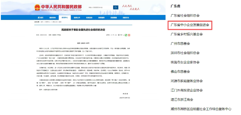 民政部近日于官网发布《民政部关于表彰全国先进社会组织的决定》,授予286个社会团体、社会服务机构和基金会“全国先进社会组织”称号。广东省中小企业发展促进会(简称“省促进会”)再次荣获“全国先进社会组织”称号。