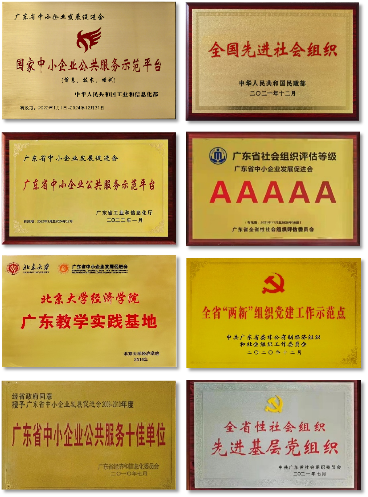 省促进会相关工作获多方肯定,先后荣获“国家中小企业公共服务示范平台”、“广东省中小企业公共服务示范平台”、“APEC商务旅行卡承办单位”、“全省性社会组织先进基层党组织”、“北京大学经济学院广东教学实践基地”等资质及荣誉称号。