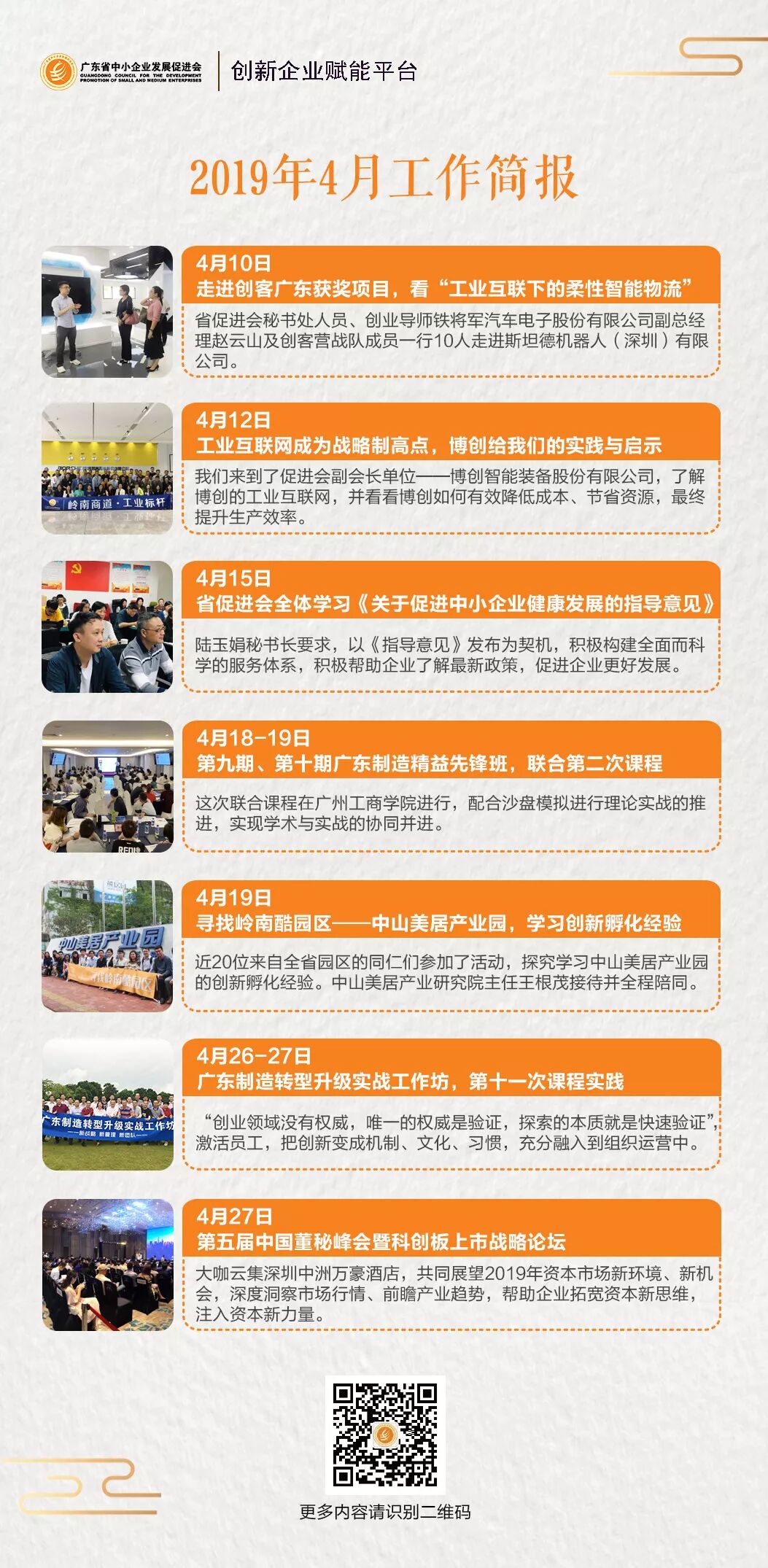 省促进会秘书处人员、创业导师铁将军汽车电子股份有限公司副总经理赵云山及创客营战队成员一行10人走进斯坦德机器人(深圳)有限公司。 4月12日 工业互联网成为战略制高点 博创给我们的实践与启示 我们来到了促进会副会长单位——博创智能装备股份有限公司,了解博创的工业互联网,并看看博创如何有效降低成本、节省资源,最终提升生产效率。 4月15日 省促进会全体学习《关于促进中小企业健康发展的指导意见》 陆玉娟秘书长要求,以《指导意见》发布为契机,积极构建全面而科学的服务体系,积极帮助企业了解最新政策,促进企业更好发展。 4月18-19日 第九期、第十期广东制造精益先锋班,联合第二次课程 这次联合课程在广州工商学院进行,配合沙盘模拟进行理论实战的推进,实现学术与实战的协同并进。 4月19日 寻找岭南酷园区——中山美居产业园,学习创新孵化经验 近20位来自全省园区的同仁们参加了活动,探究学习中山美居产业园的创新孵化经验。中山美居产业研究院主任王根茂接待并全程陪同。 4月26-27日 广东制造转型升级实战工作坊 第十一次课程 “创业领域没有权威,唯一的权威是验证,探索的本质就是快速验证” ,激活员工,把创新变成机制、文化、习惯,充分融入到组织运营中。 4月27日 第五届中国董秘峰会 暨科创板上市战略论坛 大咖云集深圳中洲万豪酒店,共同展望2019年资本市场新环境、新机会,深度洞察市场行情、前瞻产业趋势,帮助企业拓宽资本新思维,注入资本新力量。
