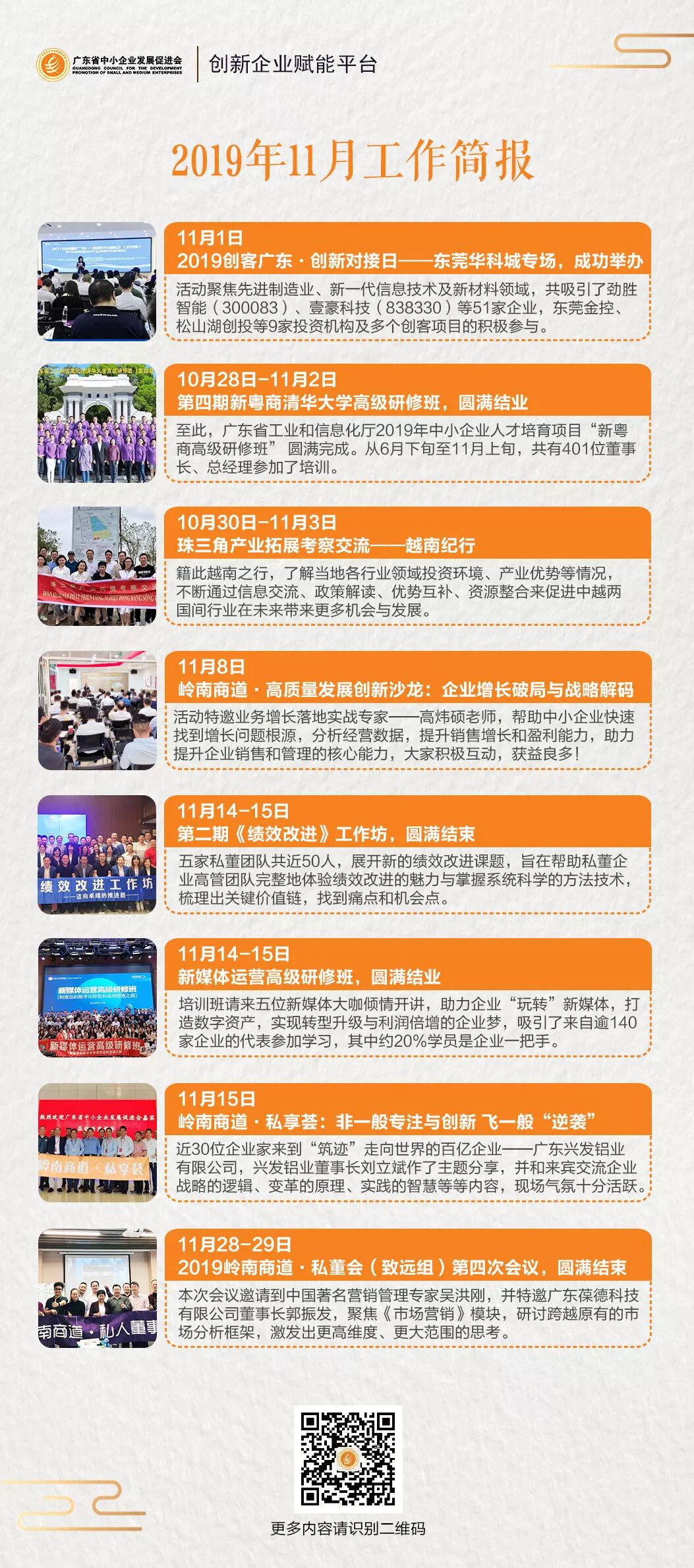 11月1日 2019创客广东·创新对接日——东莞华科城专场,成功举办 10月28日-11月2日 第四期新粤商清华大学高级研修班圆满结业 10月30日-11月3日 珠三角产业拓展考察交流——越南纪行 11月8日 岭南商道·高质量发展创新沙龙——企业增长破局与战略解码 11月14-15日 第二期《绩效改进》工作坊圆满结束 11月14-15日 新媒体运营高级研修班圆满结业 11月15日 岭南商道·私享荟——非一般专注与创新 飞一般“逆袭” 11月28-29日 2019岭南商道·私董会(致远组)第四次会议圆满结束