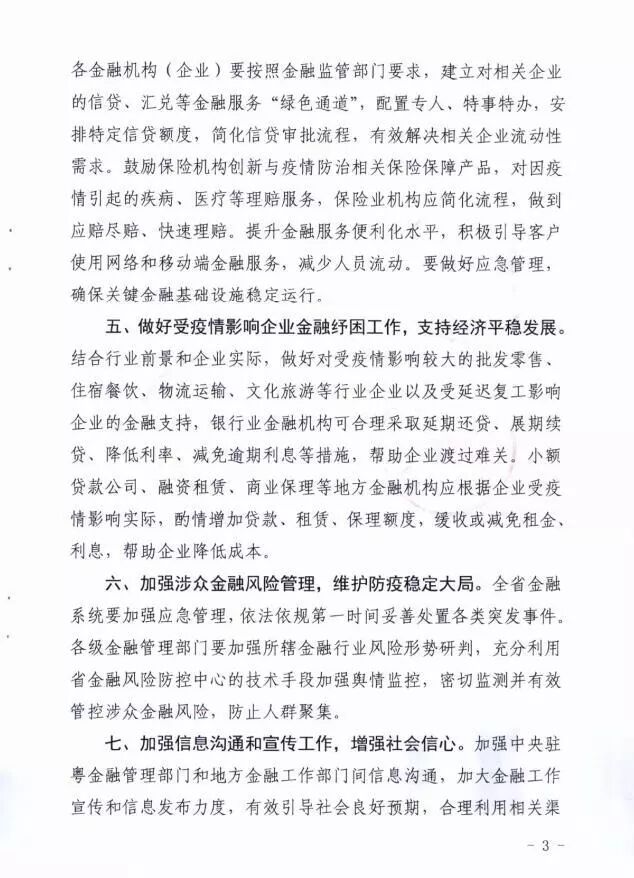 为了做好疫情防控期间金融服务工作,广东省地方金融监督管理局、人民银行广州分行、广东银保监局、广东证监局联合下发《关于做好疫情防控期间金融服务和安全稳定工作的通知》(下简称《通知》)。《通知》就做好疫情防控期间金融服务和安全稳定工作提出七条措施。
