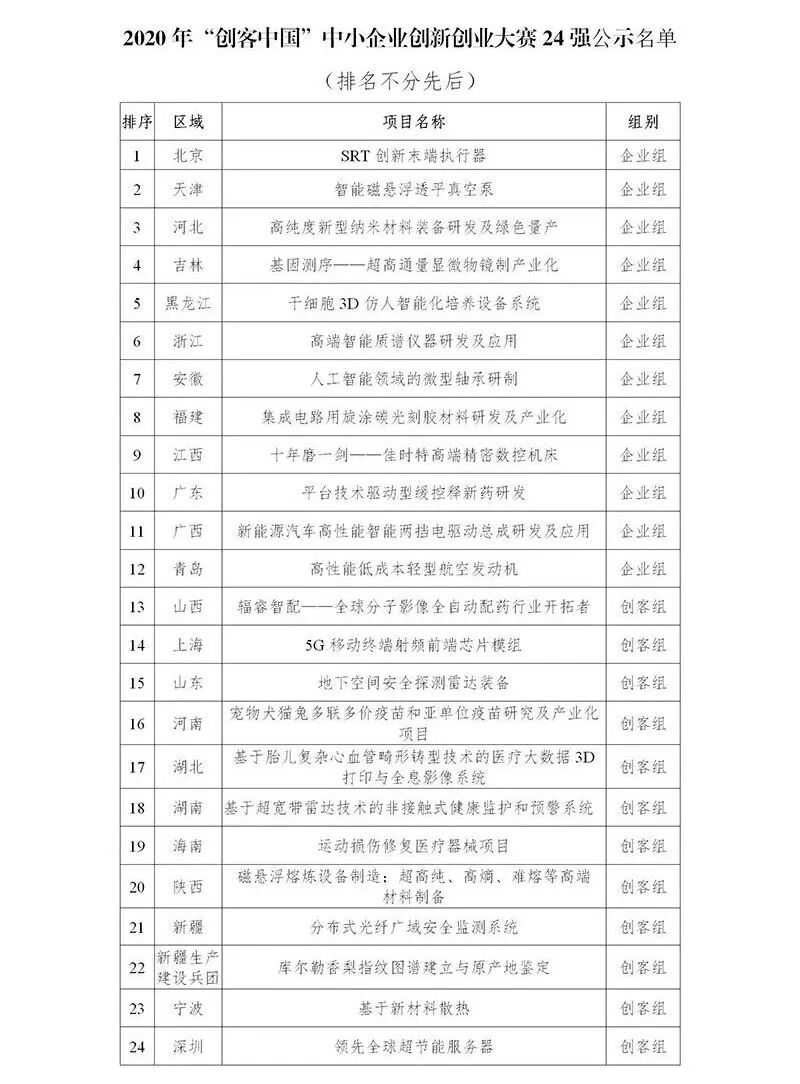 附件:2020年“创客中国”中小企业创新创业大赛24强公示名单
